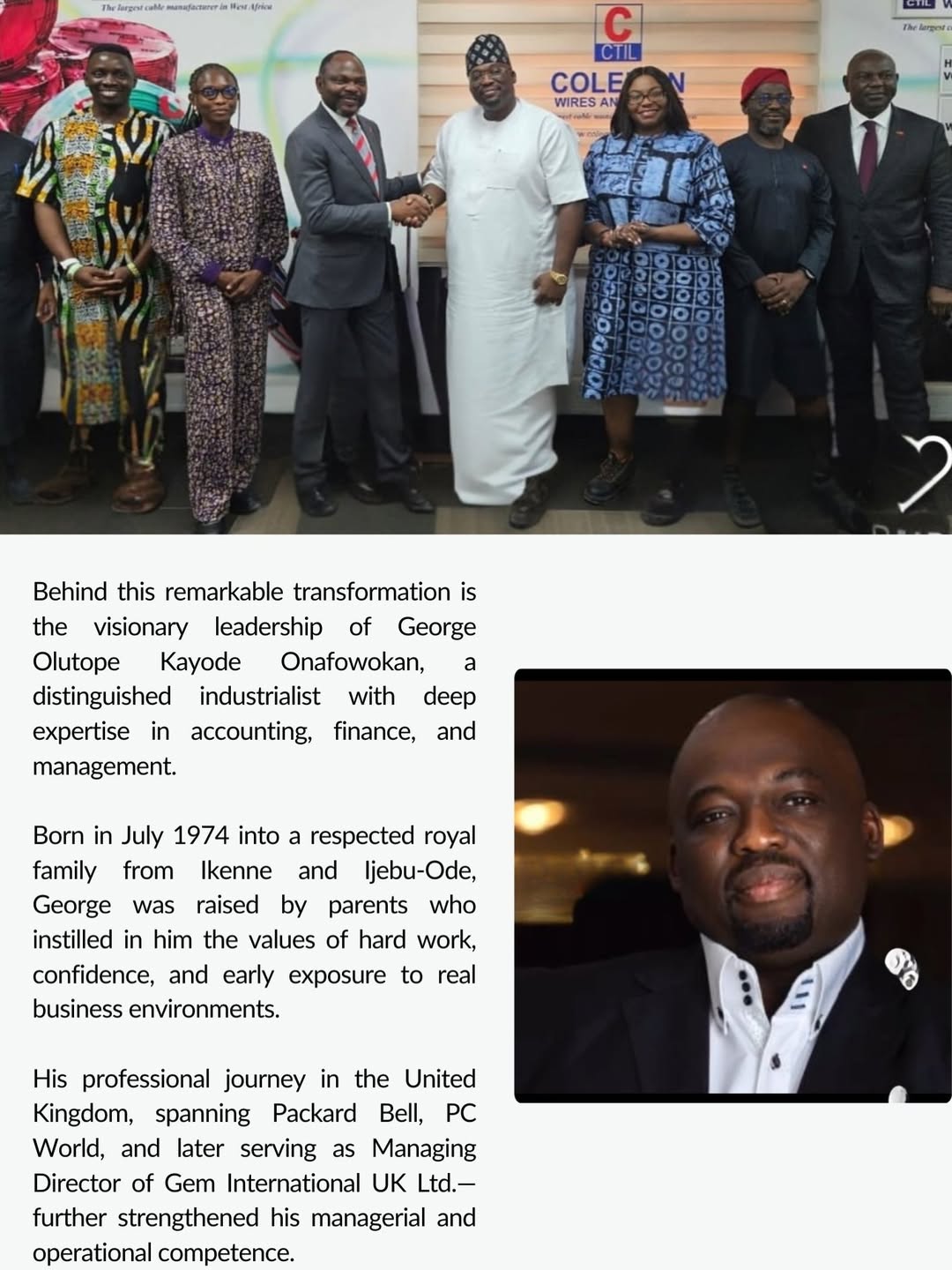 With over 15 years of transformative leadership, Engr. George Onafowokan, FNSE, has positioned Coleman Wires and Cables as a world-class manufacturer, expanding production across copper, aluminium, and fibre-optic cables to support large-scale industrial and infrastructure development.